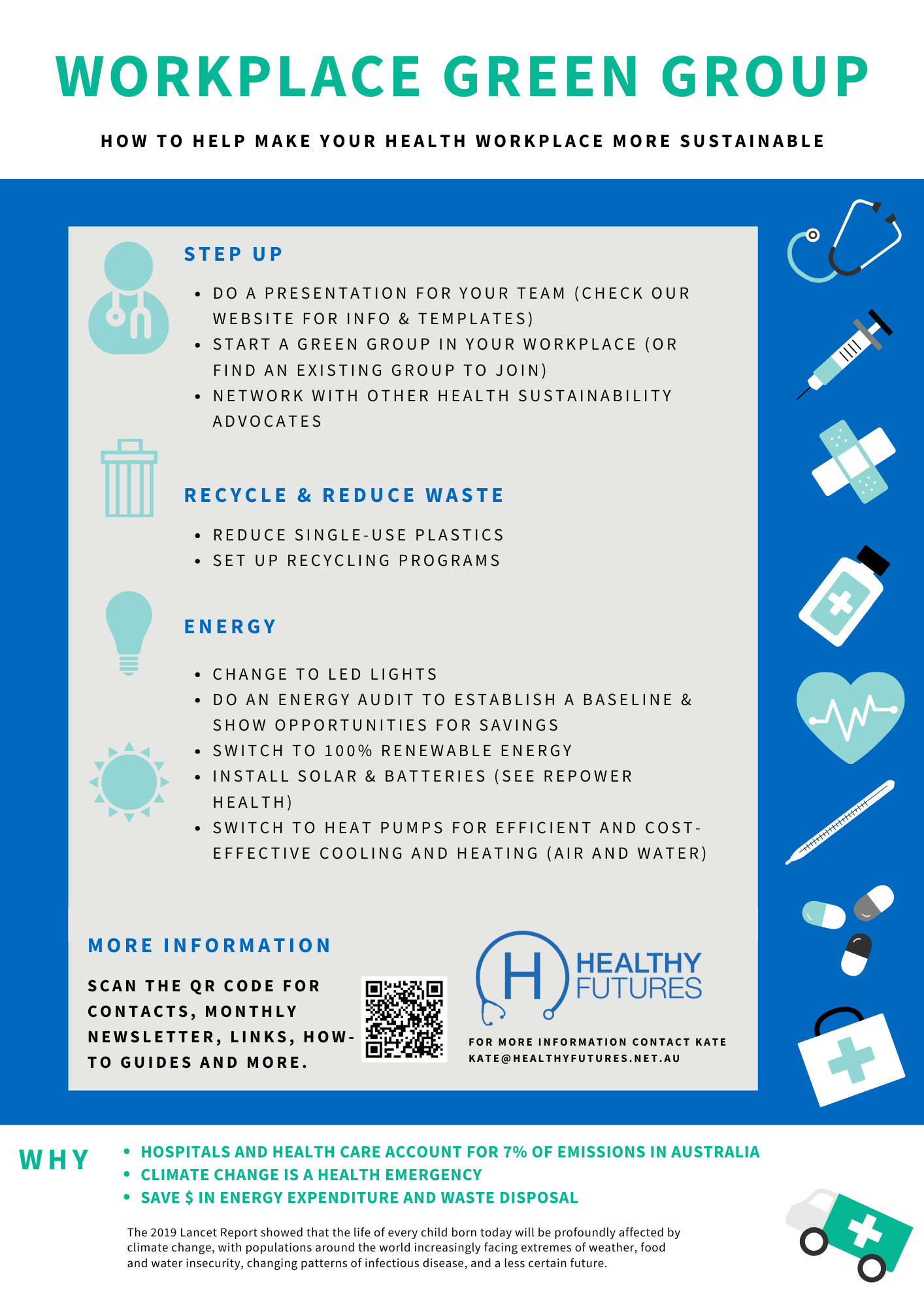 Hospitals and health care account for 7% of emissions in Australia, and we know that climate change impacts negatively on human health. Making changes can save your hospital or health system significantly in terms of costs, energy expenditure and waste disposal. We've collected some ideas below on how you can get involved in being part of the solution and help your workplace become greener.