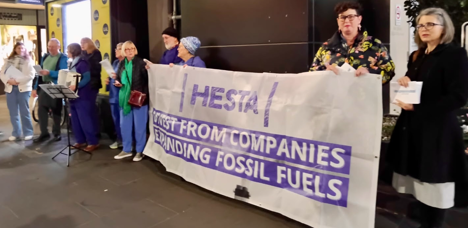 This year, we also held close talks with HESTA, encouraging them to divest from methane-polluting companies. Whilst they were attuned and open to these conversations, they were unwilling to drop their ongoing, relatively small ownership in Santos and Woodside, two super methane-polluting companies. To alert HESTA members to the harms of these investments, we handed out flyers at a number of HESTA events, and their offices and at a HESTA awards ceremony alongside Market Forces and Climate Choir Melbourne.